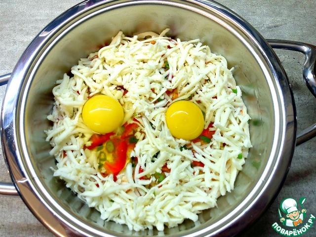 Посыпаем тертым сыром, сверху аккуратно разбиваем 2 яйца. Посыпаем красным молотым перцем.