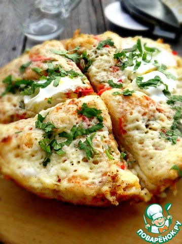 По истечении 15 минут огонь выключаем и оставляем пирог еще на 10 минут в сотейнике. Затем пирог извлекаем и посыпаем рубленной зеленью кинзы.
