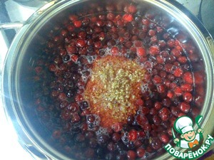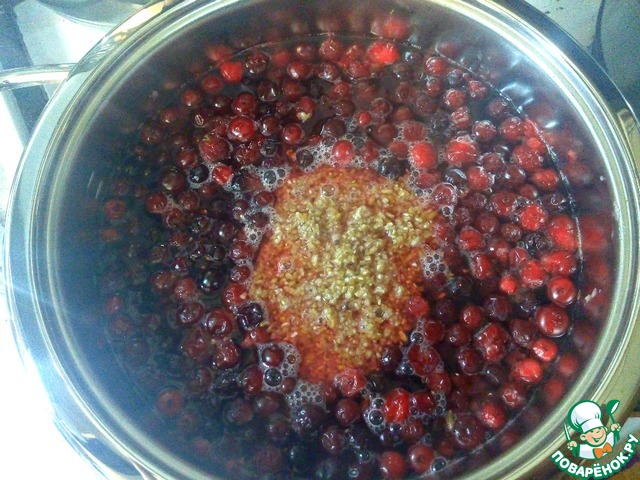 Добавить к клюкве промытую пшеничную крупу, накрыть крышкой.