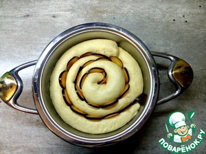 Укладываем три заготовки в сотейник Zepter спиралью. На дно, для удобства извлечения, я положила круг пергамента. Сливы нарезаем на дольки и вставляем дольки между слоями спирали. Ставим на медленный огонь, накрываем крышку и включаем духовку на 180С.