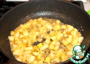 В сковороде нагреть сливочное масло, растопить в нем сахар, положить нарезанные кубиком яблоки и тушить 3 минуты, пока яблоки не станут мягкими.