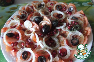 Очень вкусный и легкий салатик с помидором, зeрнами граната и соусом. Очень хорошо подходит этот салатик к праздничному столу.