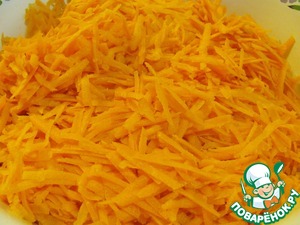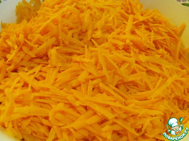 Трем на крупной терке морковь и складываем в большую миску.
