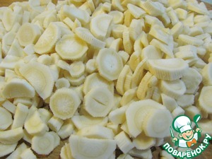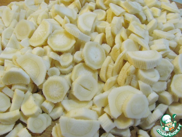 Корень петрушки нарезаем произвольно, по вашему вкусу. Мы любим когда корень виден в супах, поэтому нарезаю его крупно.
