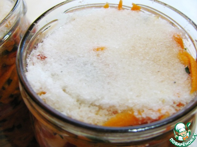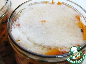 Складываем овощи в сухие банки. Плотно утрамбовываем. При этом будет выделяться сок, он не нужен. В каждую банку, сверху снова засыпаем соль. Примерно по 1-2 чайной ложки.