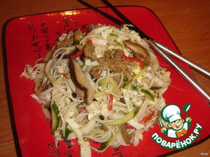 Благодаря капусте и огурцу, салат получился очень сочный. Лапша придала салату нежности, мясо и грибы сытости. Если любите поострее, добавьте еще молотого красного перца. Мой супруг не любит очень острое, поэтому я ограничилась стручковым полуострым перцем.