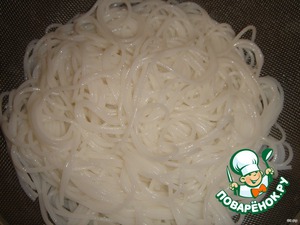 Сухую рисовую лапшу залить кипятком, закрыть крышкой и дать постоять столько времени, сколько указано на упаковке. После откинуть на дуршлаг, промыть холодной водой и дать стечь лишней воде.