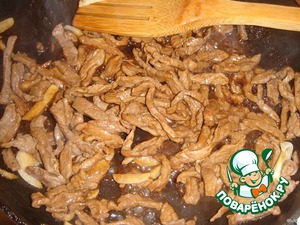 Говядину (свинину) порезать очень тонкой соломкой, обжарить с добавлением растительного масла до готовности. В конце приготовления добавить порезанный соломкой чеснок и соевый соус. Перемешать.