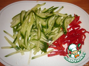 Грибы шиитаке порезать соломкой. Если грибы сухие, предварительно залить кипятком и подготовить, как указано на упаковке.