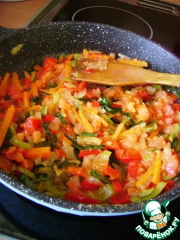 Нашинковать лук и зелень порея соломкой, морковь и перцы –брусочками. Не спеша, на среднем огне, спассеровать овощи на масле до мягкости, не давая им активно румяниться. Добавить обесшкуренные помидоры и тушить до загустения пассеровки.