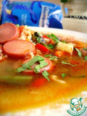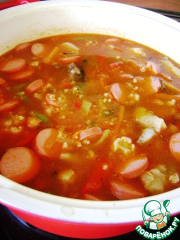 Опустить пассеровку, добавить нарезанные кружочками сосиски. Дать закипеть. Посолить по вкусу, всыпать зелень и пряности. Выключить и дать настояться под крышкой 15 минут.