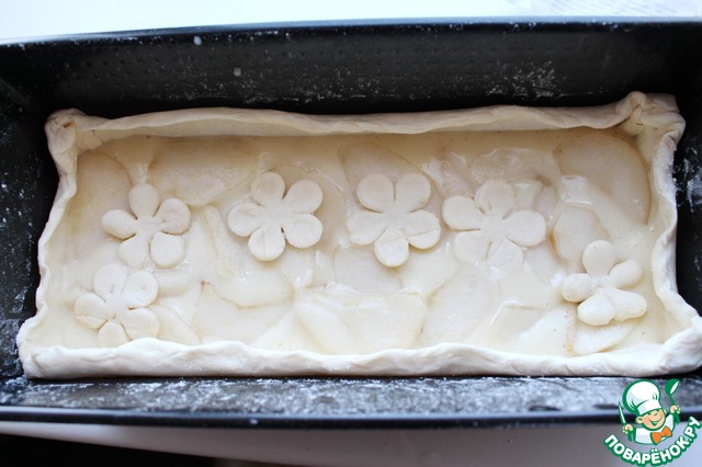 У меня был прямоугольник готового слоеного теста размером 30 на 20 см. Тесто немного раскатать, переложить в прямоугольную форму и немного придавить его к краям. Сверху присыпать мукой при помощи ситечка.