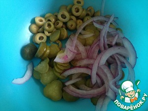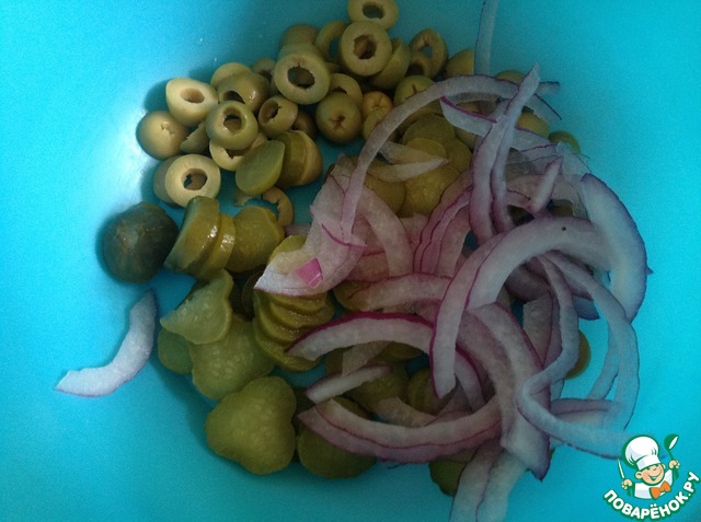 Фасоль поставить отваривать в подсоленной воде. Предварительно отрезав хвостики у фасоли. Оливки и огурцы нарезать колечками, лук полукольцами.