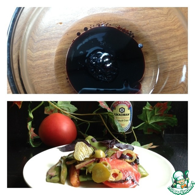 Делаем заправку для салата: в пиале соединить и размешать соевый соус, бальзамический уксус и масло. Заправить салат и аккуратно перемешать.