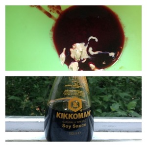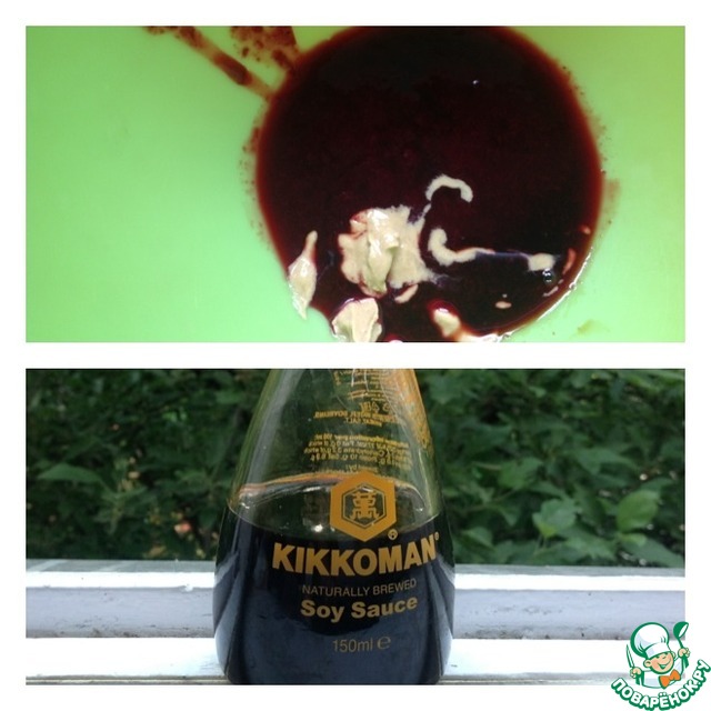 В посуду для маринования влить соевый соус, ткемали и горчицу.