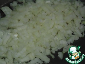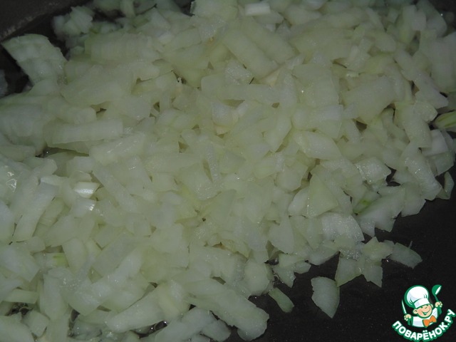 • Репчатый лук мелко порезать и обжарить на растительном масле до золотистого цвета.