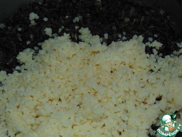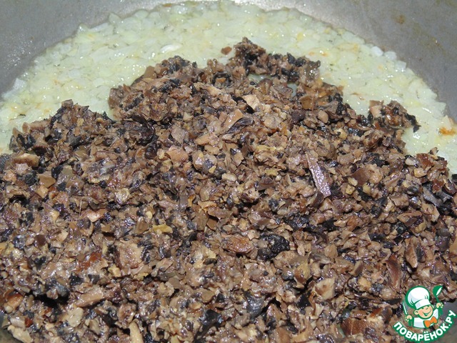 • Грибы измельчить процессором и отправить к луку, потушить 5-7 минут.
