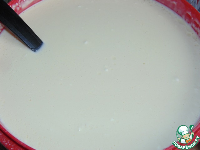 • Все ингредиенты для блинов должны быть комнатной температуры. Всё, кроме муки, смешать. Постепенно ввести муку, доводя до консистенции жидкого блинного теста. Мука бывает разная, поэтому невозможно написать её точное количество.
