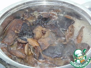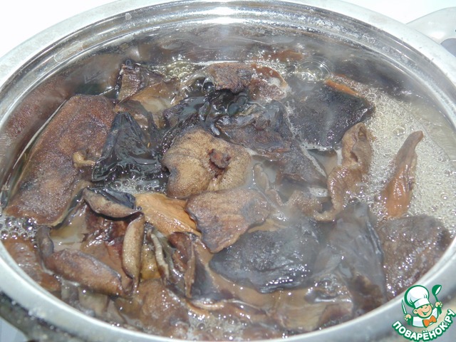 • Сухие грибы заранее замочить и отварить в соленой воде.