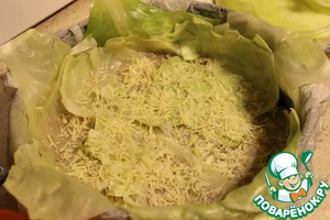 Посыпать сыром натертым на мелкой терке, сверху опять выложить фарш и капустные листья. Третий слой повторить.