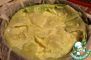 Разъемную форму (d - 24 см) застелить пергаментом, выложить капустные листья по дну и бортикам.