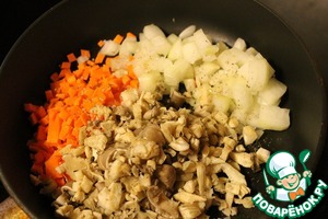 Лук, морковь и грибы нарезать мелкими кубиками и обжарить до золотистого цвета.