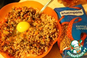 В фарш добавить обжаренные овощи, гречку, 1 яйцо, посолить и поперчить по вкусу. Тщательно перемешать и разделить на три части.