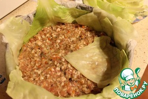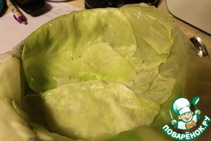 Сверху выложить одну часть фарша, разровнять. Накрыть капустными листьями.
