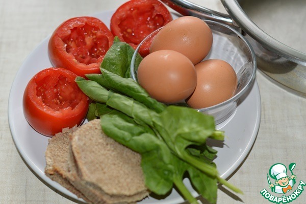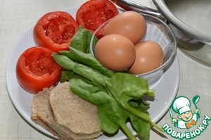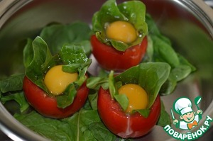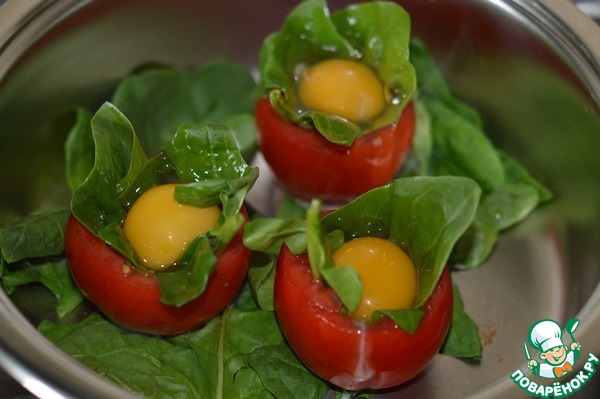 Хлеб вынуть. В помидор вложить лист шпината, вбить яйцо. В сотейник на дно положить оставшийся шпинат, затем помидоры.