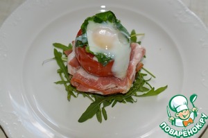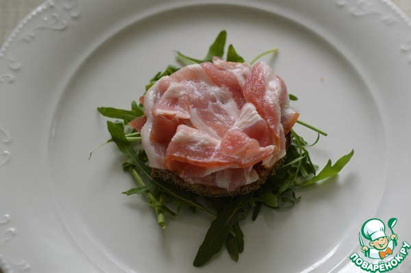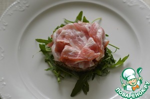 На тарелку выложить немного рукколы, сверху гренку. затем 2 ломтика бекона.