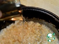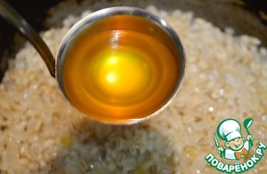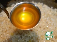 Далее добавляем бульон небольшими порциями (бульон у меня уже солёный и с добавлением молотой куркумы). Как бульон выпарится - добавляем новую порцию. Постоянно помешиваем. |