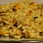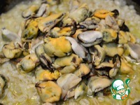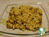 Когда перловка станет готова, выкладываем размороженные мидии. Подливаем ещё 2 порции бульона и готовим до выпаривания бульона. Не забываем помешивать, чтобы готовилось равномерно. |