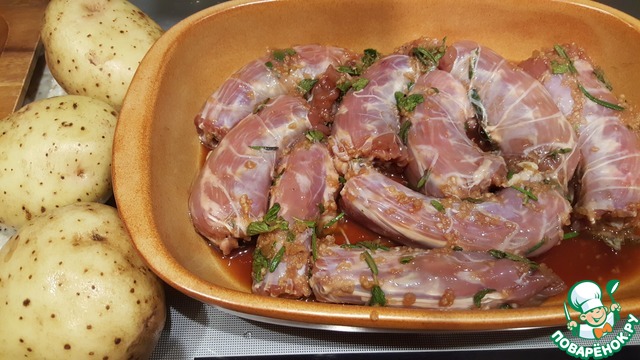 Вымыть картофель. Выложить шеи вместе с маринадом в форму для запекания. Можно использовать пакет для запекания.