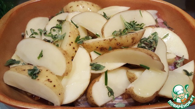 Нарезать дольками картофель и выложить к шеям. Добавить к картофелю листочки орегано и розмарина, збрызнуть растительным маслом, желательно кунжутным.