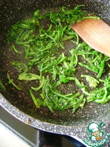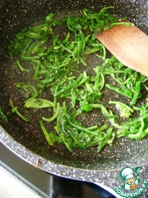 Зелень лука-порея тонко нашинковать и слегка обжарить на топленом масле, не давая румяниться.