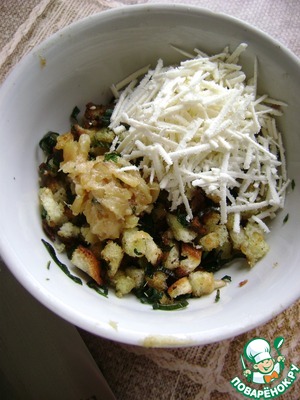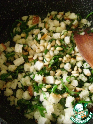 Добавить нарезанный мелкими кубиками батон и кедровые орешки, жарить до подрумянивания и образования корочки на батоне.
