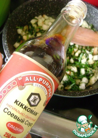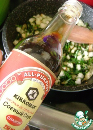 Полить сладким соевым соусом – я пользуюсь ТМ «Киккоман», перемешать и выпарить.