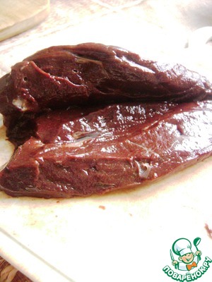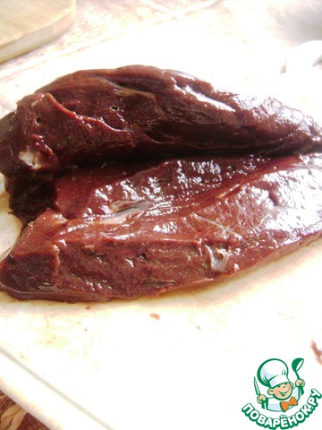 Кусок печени удобнее взять с краю, снять с него пленку и удалить протоки. Прорезать карман. У меня, увы, внутри куска оказались крупные протоки и пришлось немного обрезать кусок.
