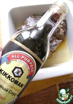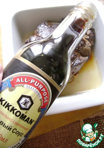 Переложить в форму для запекания, полить соевым соусом –здесь лучше использовать классический ТМ «Киккоман», добавить сухое вино. Поставить в разогретую до 180 градусов духовку минут на 20-25.