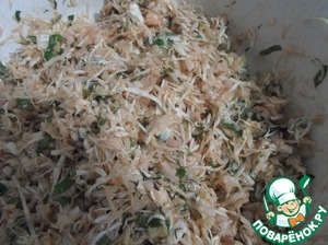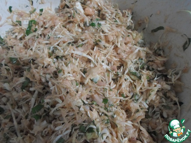 Капусту мелко шинкуем, копченое куриное филе режем на мелкие кубики. Добавляем рубленную зелень петрушки и укропа, кетчуп, рис. Подсаливаем и тщательно перемешиваем.