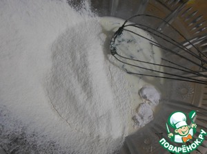 Затем добавляем муку и разрыхлитель и опять беремся за венчик.