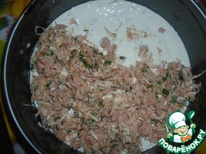 В смазанную маслом форму выливаем половину теста, а на него выкладываем начинку.