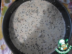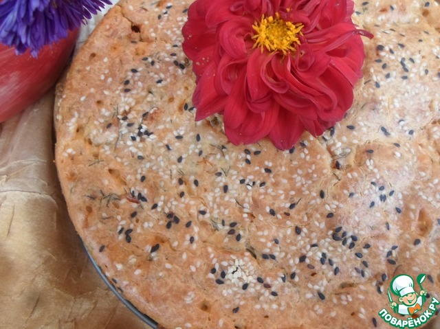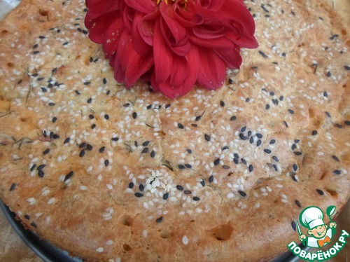 Завершаем пирог оставшимся тестом и посыпаем кунжутом. Запекаем в предварительно разогретой до 180 градусов духовке до сухой спички.