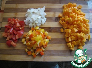 Нарезать тыкву, сладкий перец, помидоры и лук мелким кубиком. Постарайтесь сделать их одного размера.