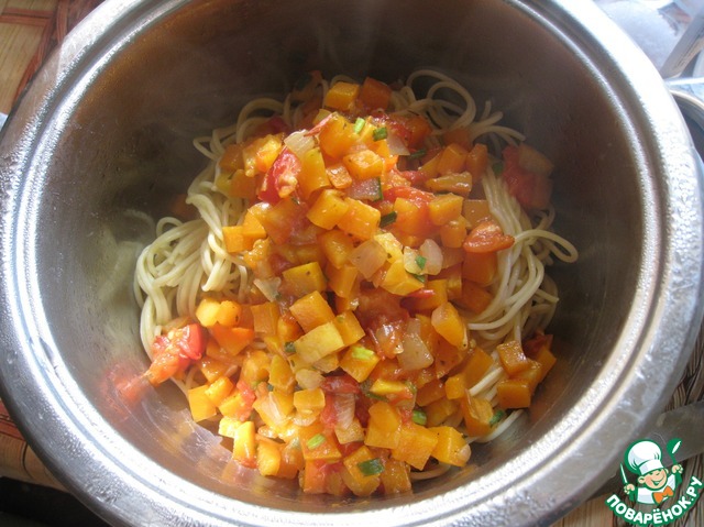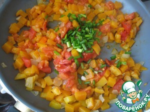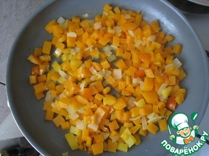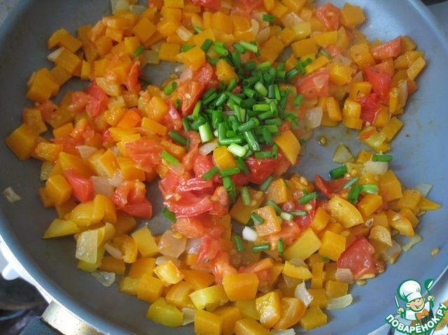 На растительном масле обжарьте тыкву, сладкий перец и лук в течение 5 минут. Добавьте помидоры, "Итальянские травы", перец.