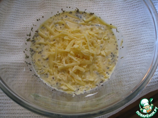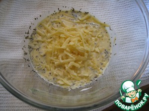 Сыр натереть на терке и добавить в яичную смесь. Перемешать.