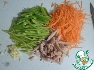 Морковь чистим, трем на терке (лучше всего предназначенной для моркови по-корейски). Перец режем тонкой соломкой, чеснок трем на мелкой терке, курицу так же режем тонкой соломкой.