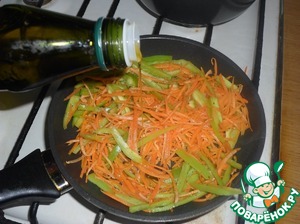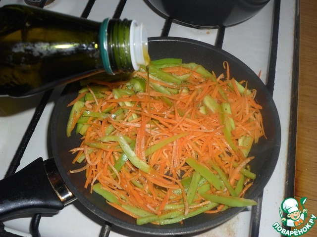 На разогретой с оливковым маслом сковороде, пассируем морковь и перец приправленные черным молотым перцем в течении 7 минут (до мягкости).