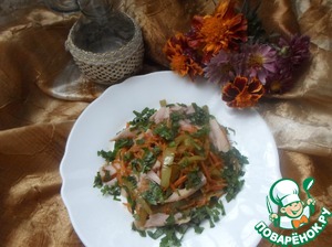 Смешиваем курицу, овощи, поливаем соусом. Тщательно перемешиваем и посыпаем рубленной зеленью петрушки.