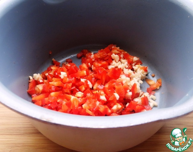 Положить в сотейник мелко нарезанные перцы без семян и чеснок.